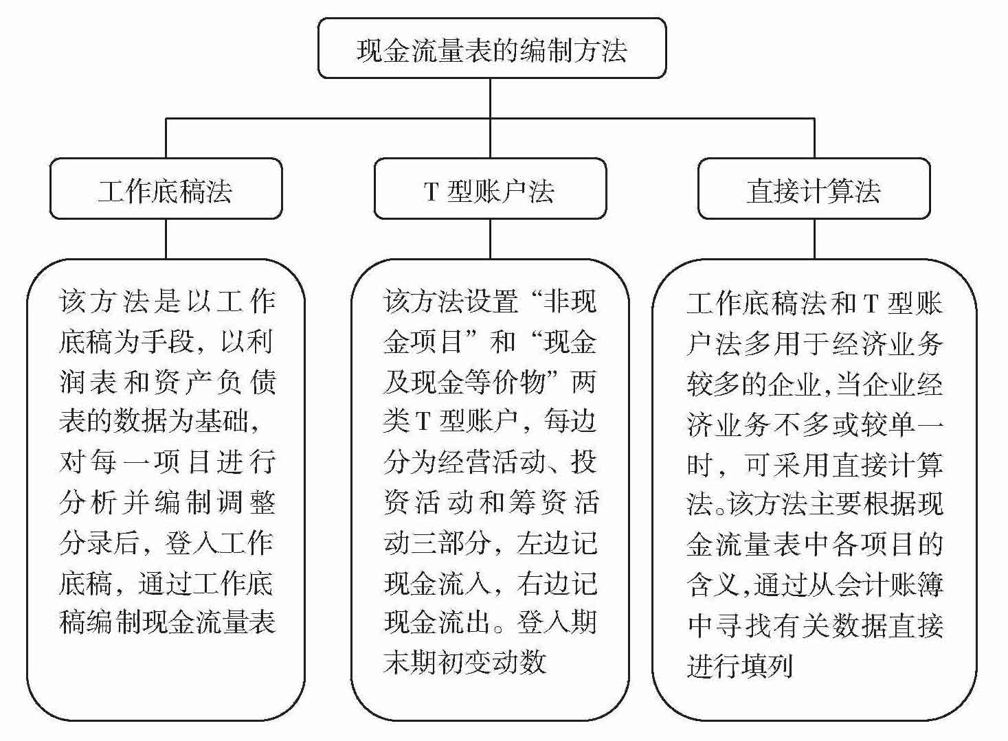 现金流量表主要有工作底稿法、T型账户法和直接计算法三种编制方法。