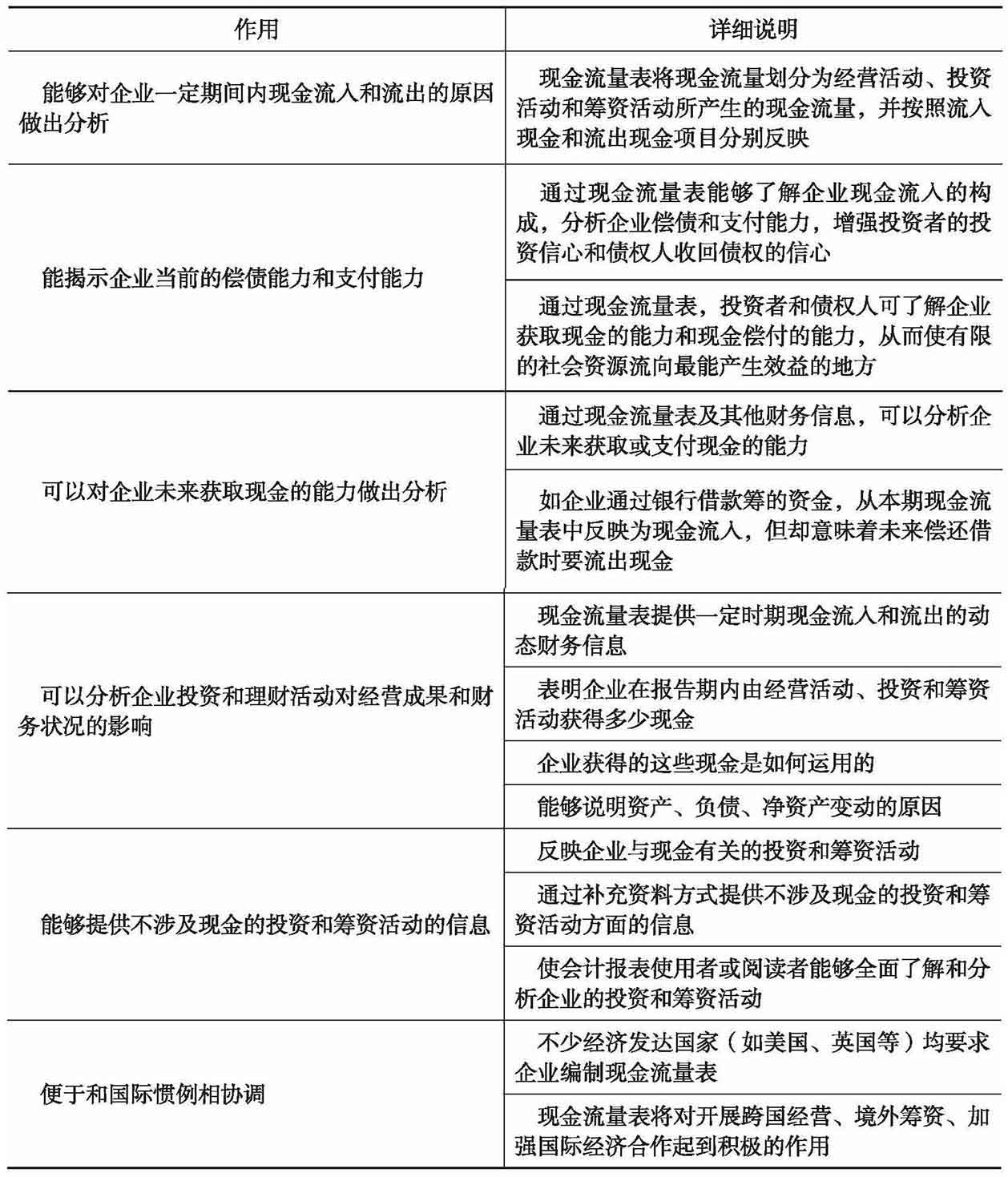 现金流量表的具体作用主要表现在表4-1所示的几个方面。