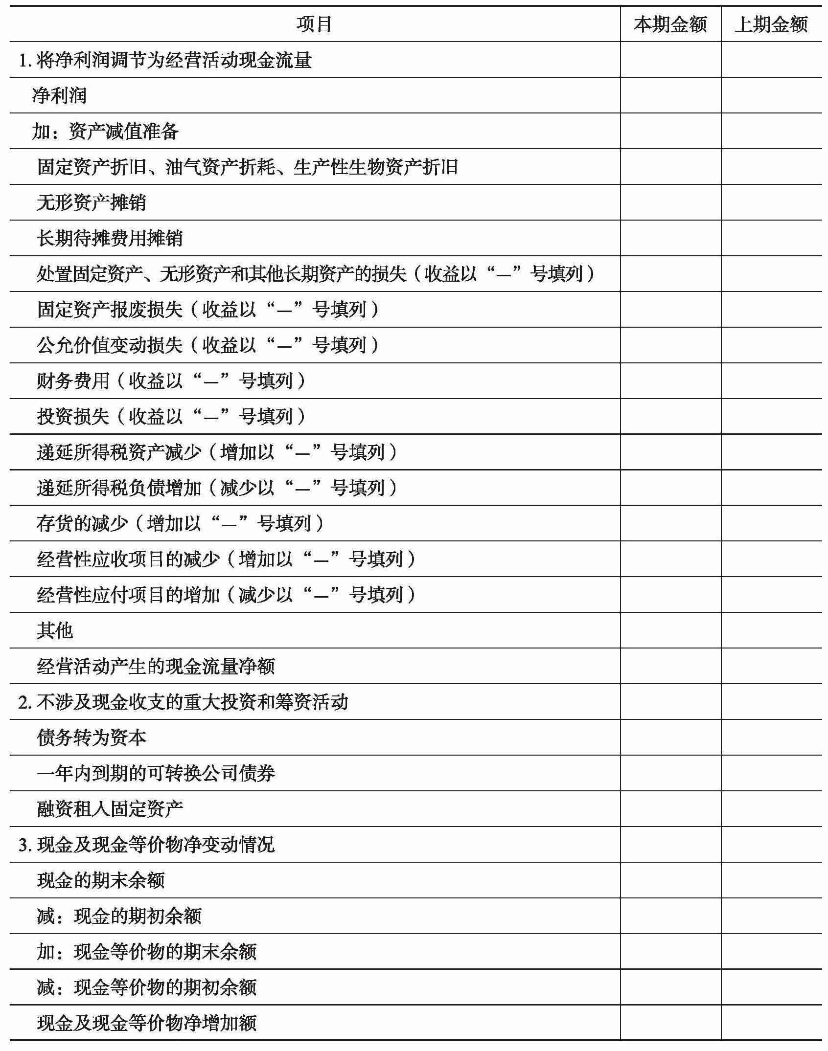 企业应当采用间接法在现金流量表附注中披露将净利润调节为经营活动现金流量的信息。现金流量表补充资料格式见表4-3。