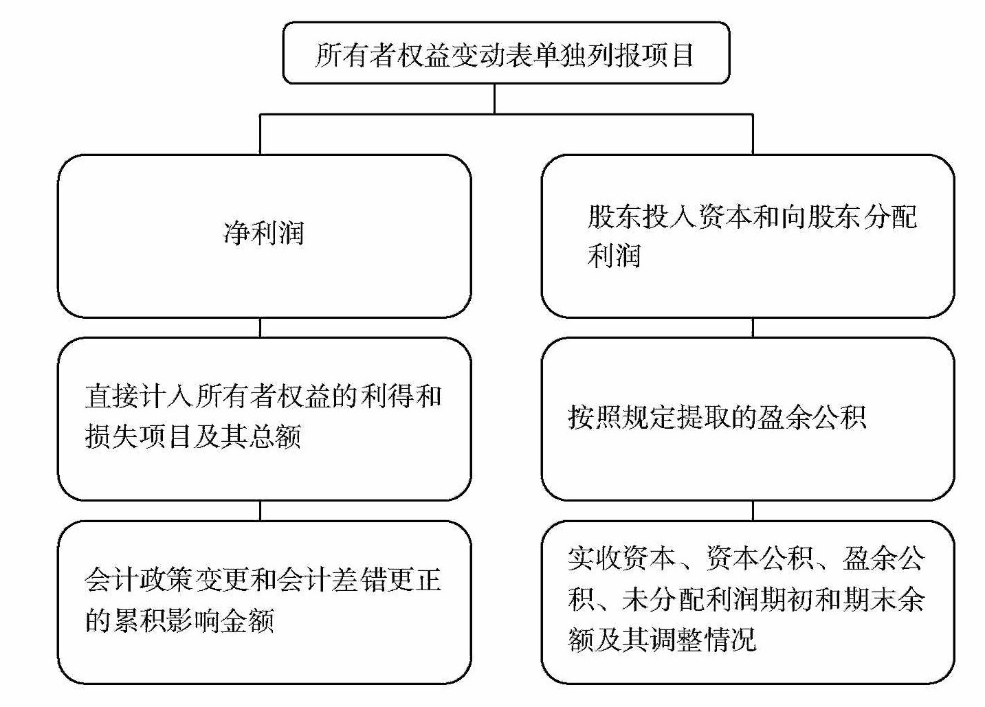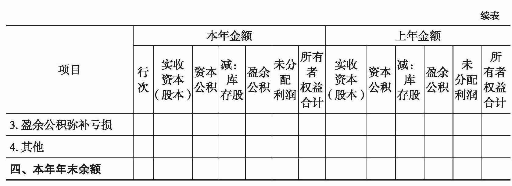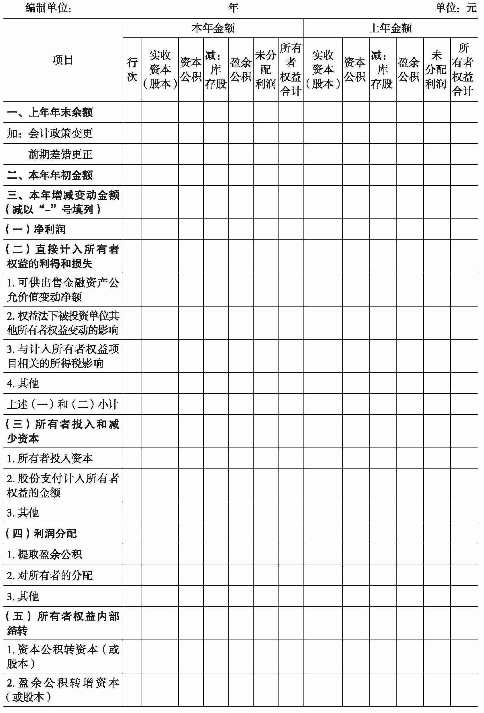 所有者权益变动表是由表头、表身和表尾三部分组成。表头应列示报表名称、编报单位、编制时间及计量单位;表身部分反映所有者权益具体情况;表尾为补充说明。所有者权益变动表的具体格式见表5-1。