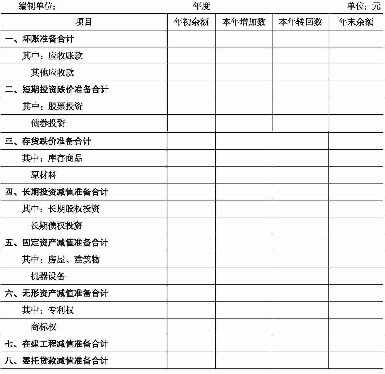资产减值准备明细表是反映企业各项资产减值增减变动情况的附表。因为在资产负债表中,资产减值准备是作为相关资产的抵减金额参与计算填列的,所以单从资产负债表中是不能反映出资产减值情况的。借助资产减值准备明细表可以观察企业资产的质量及其防范风险的能力。资产减值准备明细表的基本格式见表6-1。