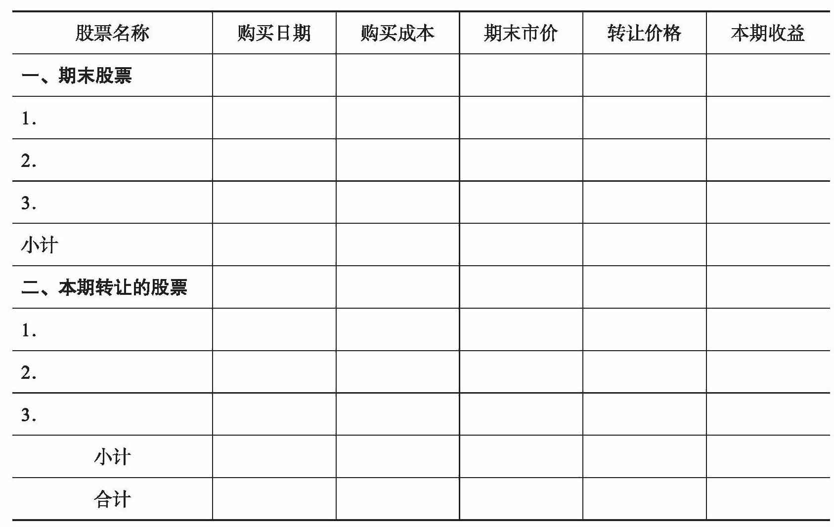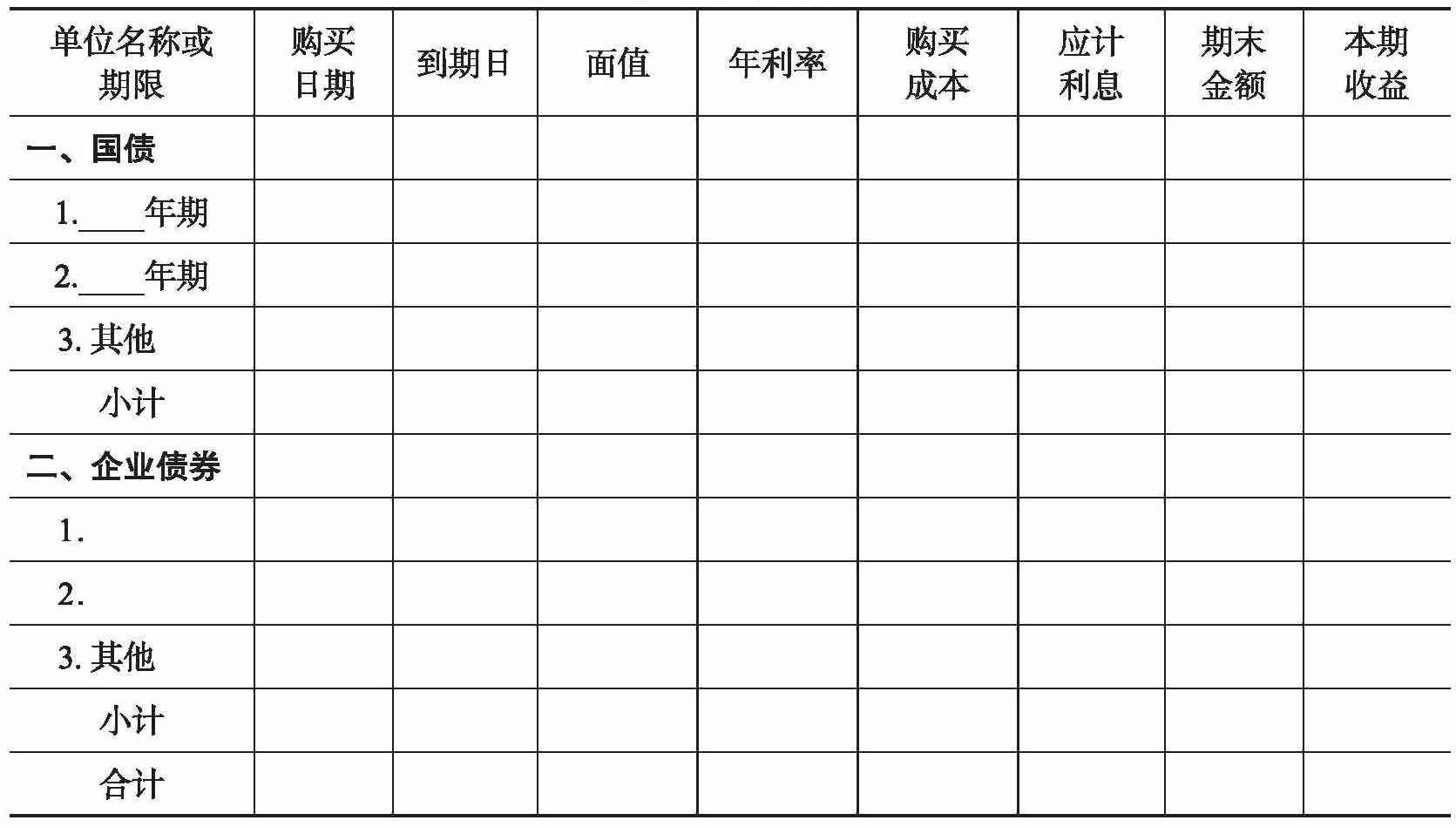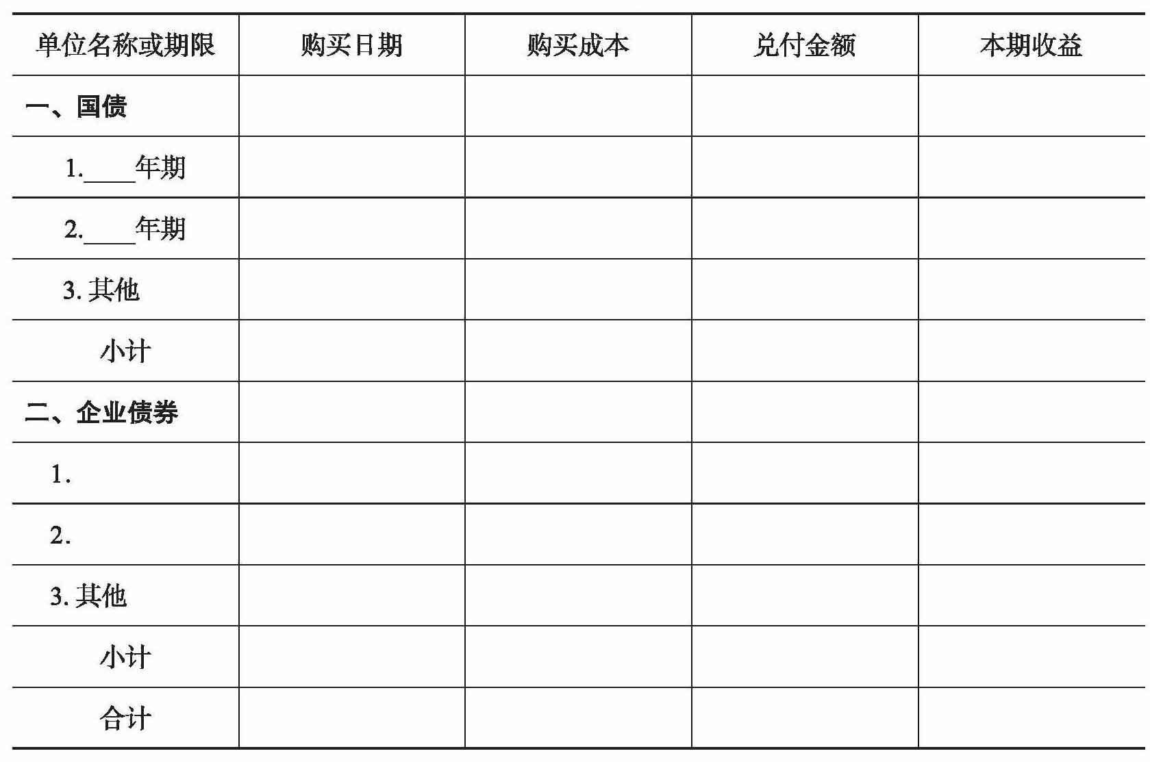 ②对本期兑付的债券应按单位列示购买日期、购买成本、兑付金额、本期收益。格式见表6-45。