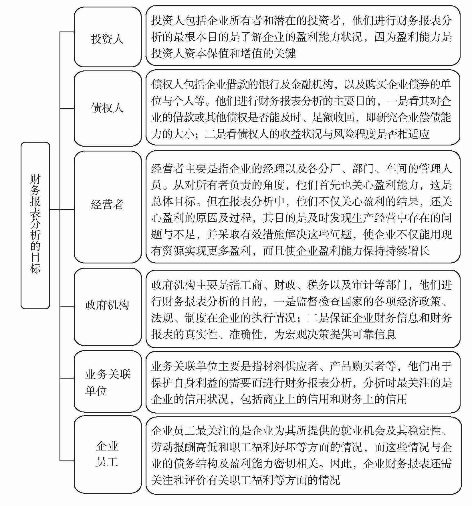 不同的报表分析主体进行报表分析的目的是不同的。所谓财务报表分析的主体是指“谁”进行财务分析,实际上就是与企业存在直接或间接利益关系的组织或个人,即利益相关者。财务报表分析的主体主要包括:企业的投资人、债权人、经营者、政府机构以及其他与企业有利益关系的人士等。由于财务报表使用者与企业利益关系的程度不同,实现自身财务利益的具体途径和方式不同,所关心的重点也是不同的。