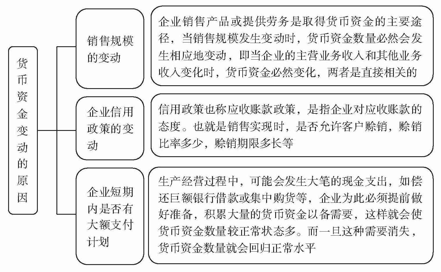 货币资金包括现金、银行存款和其他货币资金。货币资金是企业流动性最强、最有活力的资产,但同时又是获利能力最低,或者说几乎不产生收益的资产。货币资金过多或过少对企业生产经营都会产生不利影响。生产经营过程中,引起货币资金发生变动的主要原因如下。