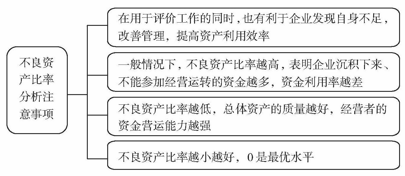 不良资产比率分析着重从资产损失、资金挂账、不良投资及账款、积压商品物资等方面反映了企业资产的质量,揭示企业在资产管理和使用上存在的问题,用以对企业资产的营运状况进行补充修正。不良资产比率分析在运用时应注意以下事项: