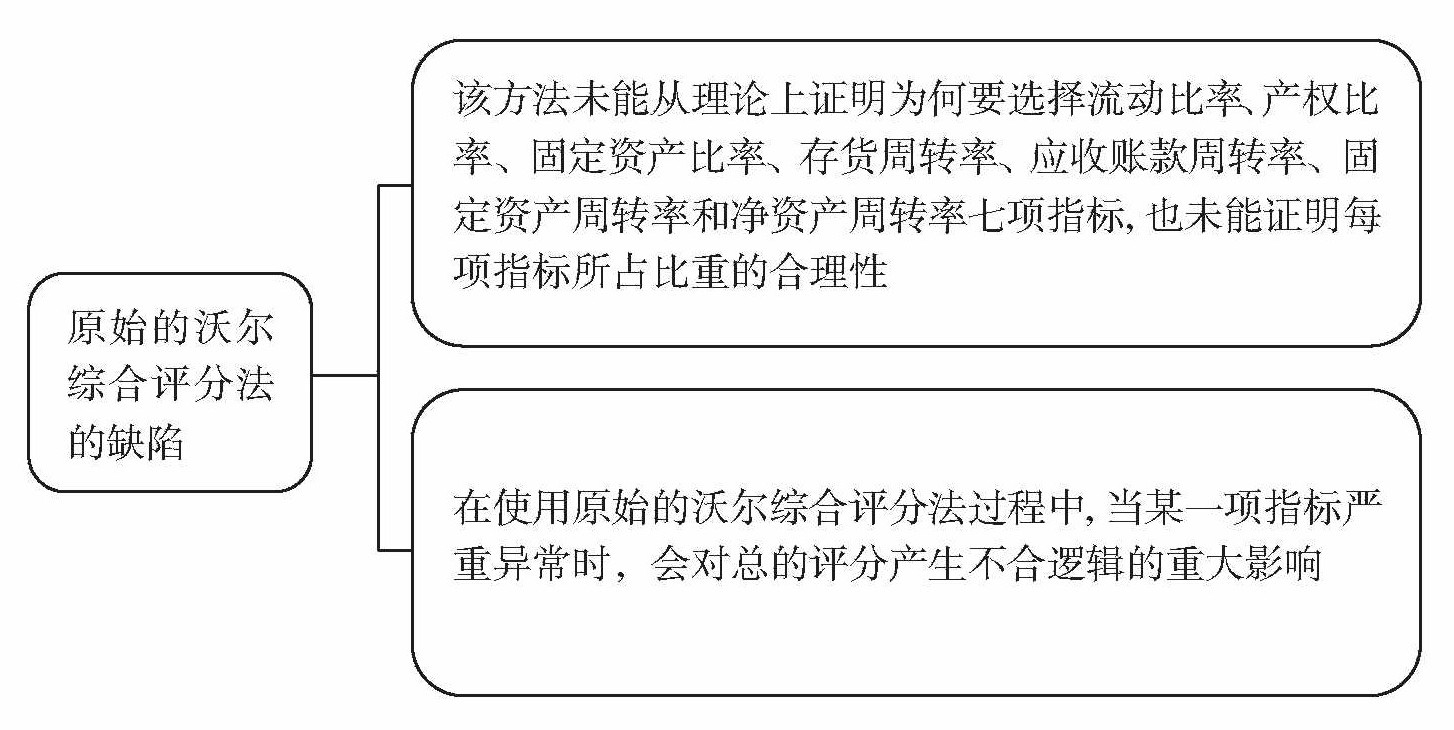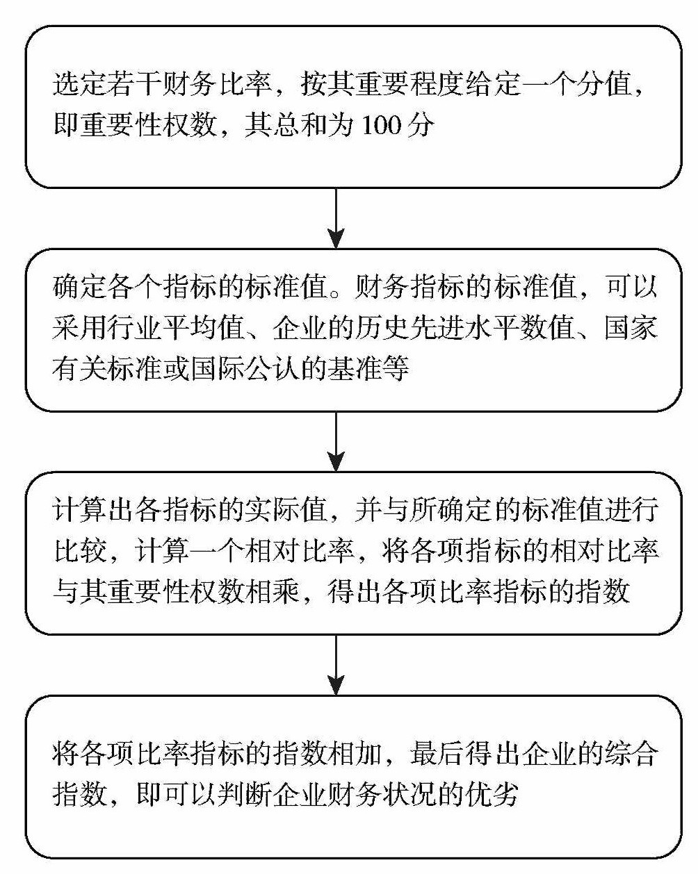 在进行财务分析时,报表使用者遇到的主要困难是计算出财务比率之后,无法判断它是高还是低,难以评价其在市场竞争中地位的优劣。为解决这个问题,财务状况综合评价的先驱者亚历山大·沃尔在1928年出版的《信用晴雨表研究》和《财务报表比率分析》等著作中提出了信用能力指数的概念,把若干个财务比率用线性关系结合起来,以此来评价企业的信用水平。沃尔选择了流动比率、产权比率、固定资产比率、存货周转率、应收账款周转率、固定资产周转率和净资产周转率七种财务比率,分别给定了其在总评价中所占的比重,总和为100分。然后确定标准比率,并与实际比率相比较,评出每项指标的得分,求出总评分。