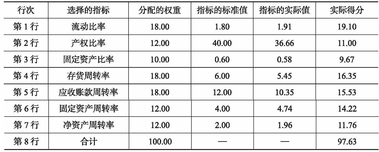 第三步,计算出各指标的实际值,并与所确定的标准值进行比较,计算一个相对比率,将各项指标的相对比率与其重要性权数相乘,得出各项比率指标的指数,见表12-9。