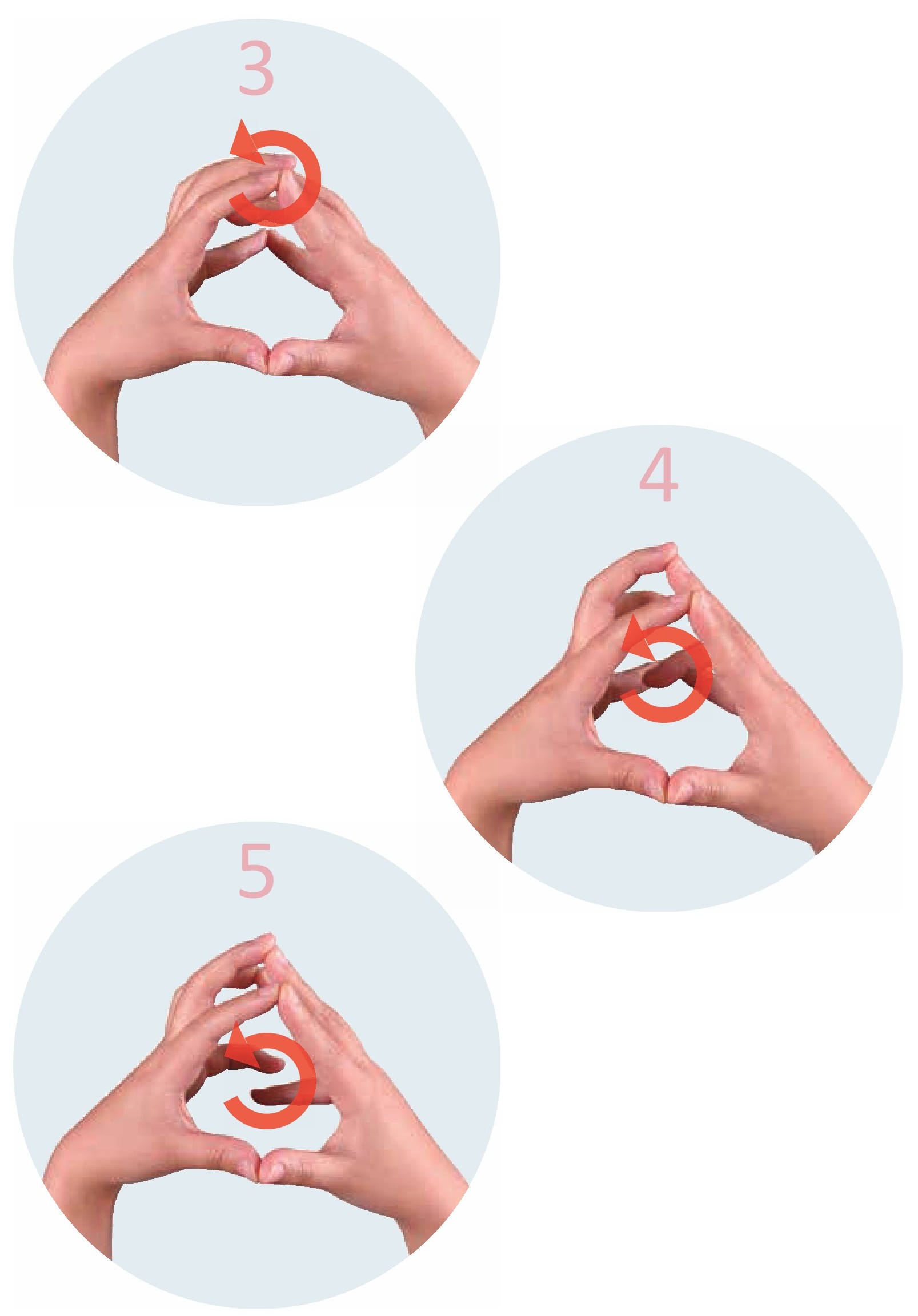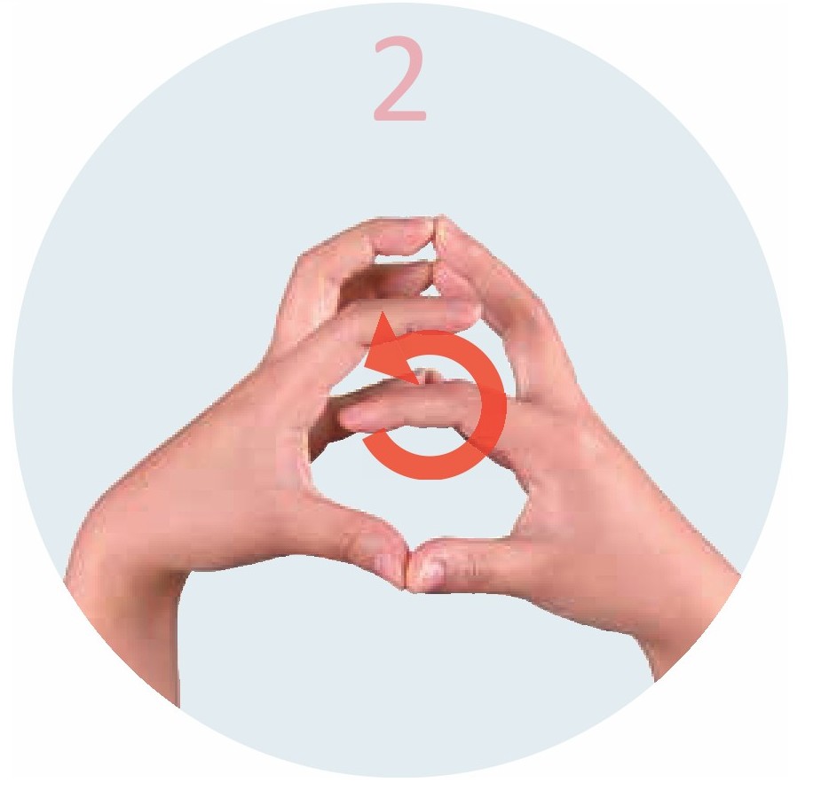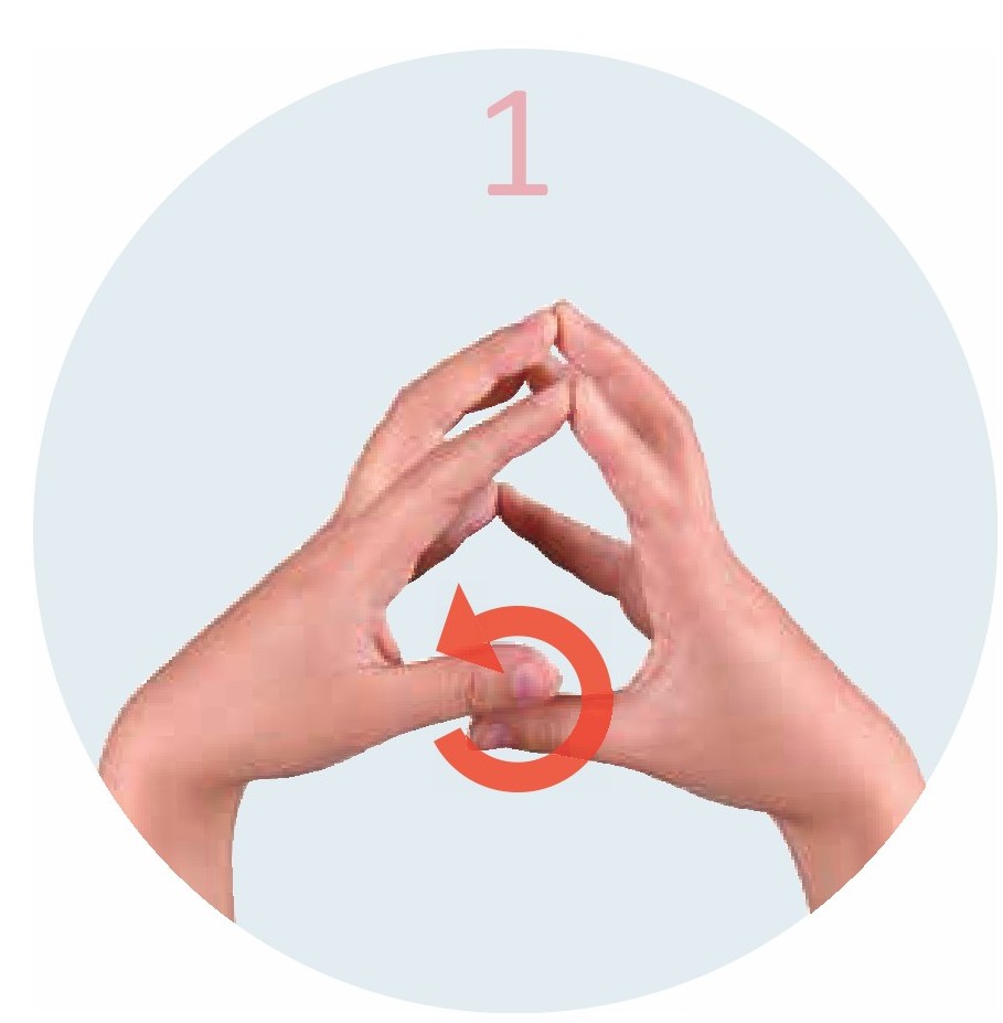 双手五指相对,拇指分开绕圈旋转,其余四指继续紧密贴合在一起,不要分开。以此类推,旋转食指、中指、无名指、小指。旋转手指时,注意力集中在手指上,默数5次。