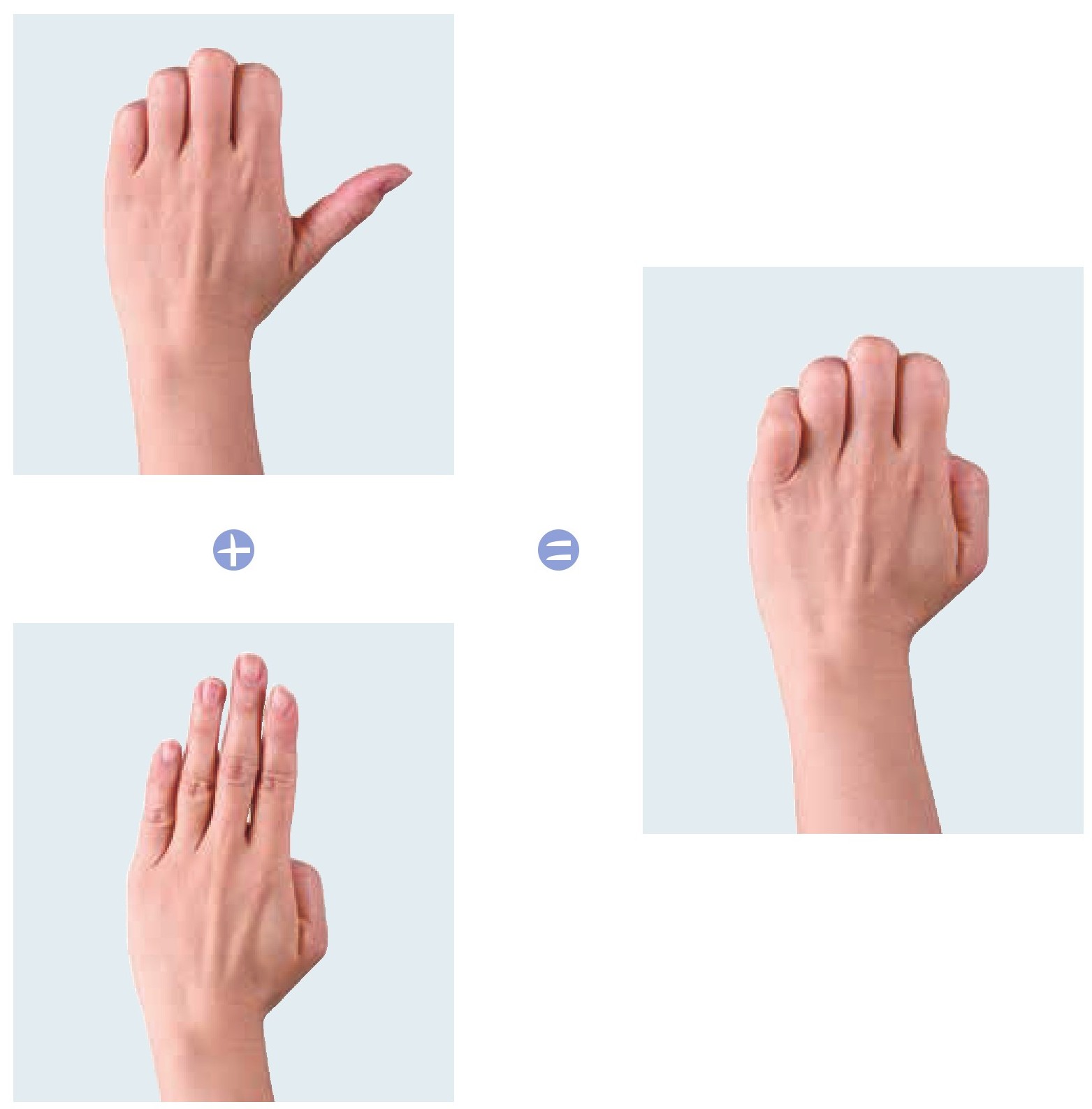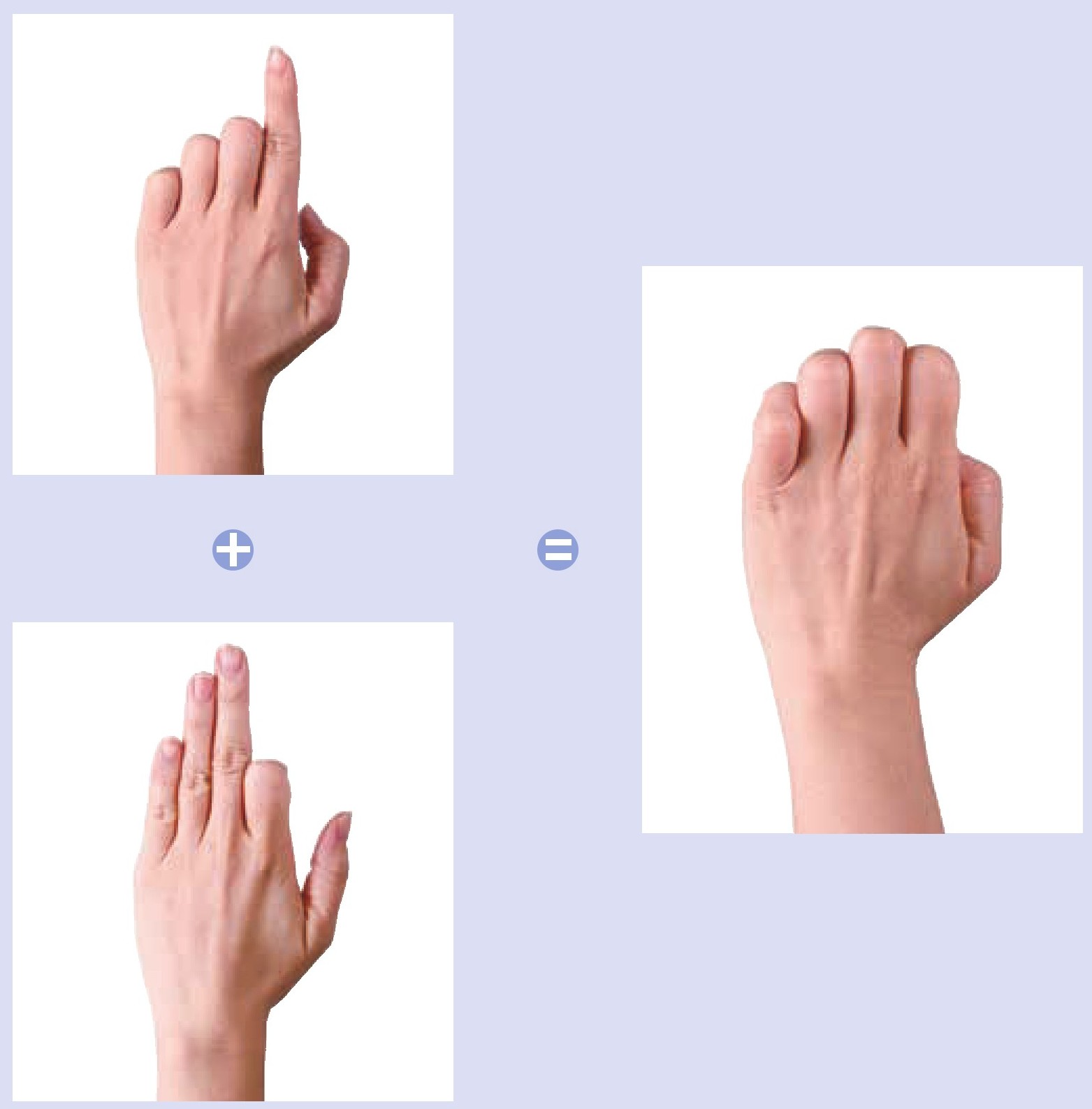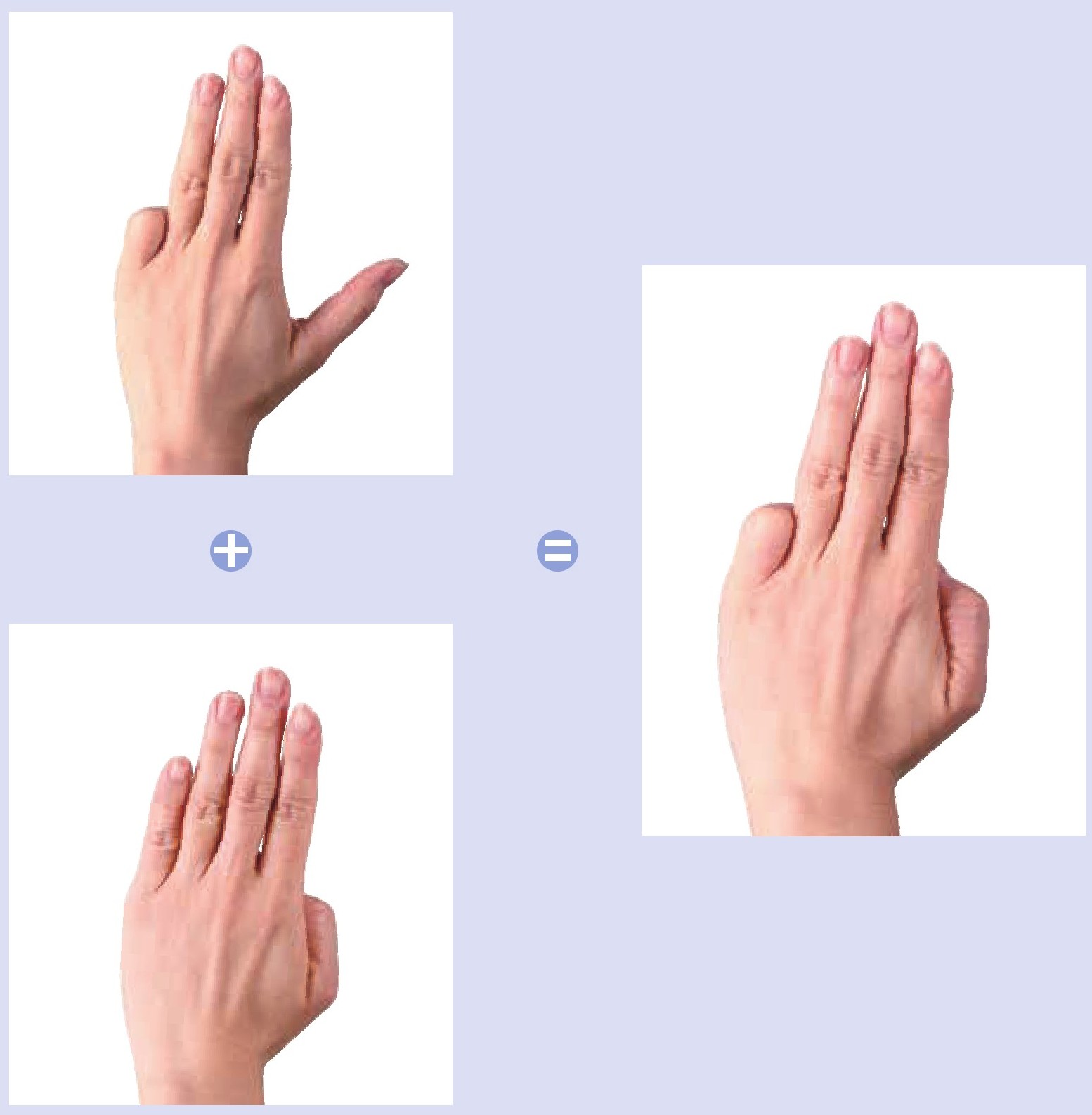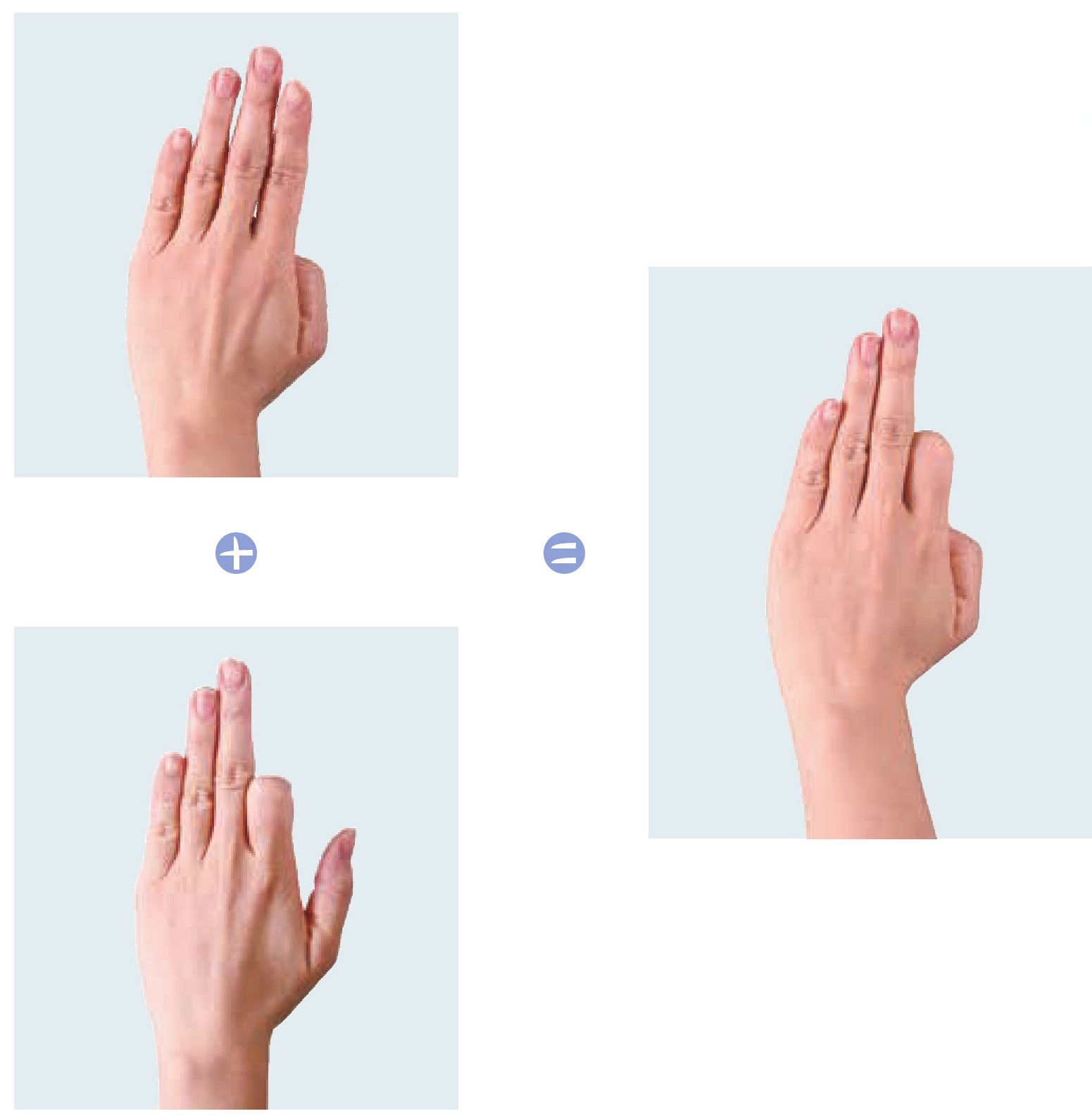 左手拇指弯曲一下伸直,同时在心里默念“1”,接着食指弯曲一下伸直,同时在心里默念“+1”,然后这两指同时弯曲不动,心里默念“=2”。