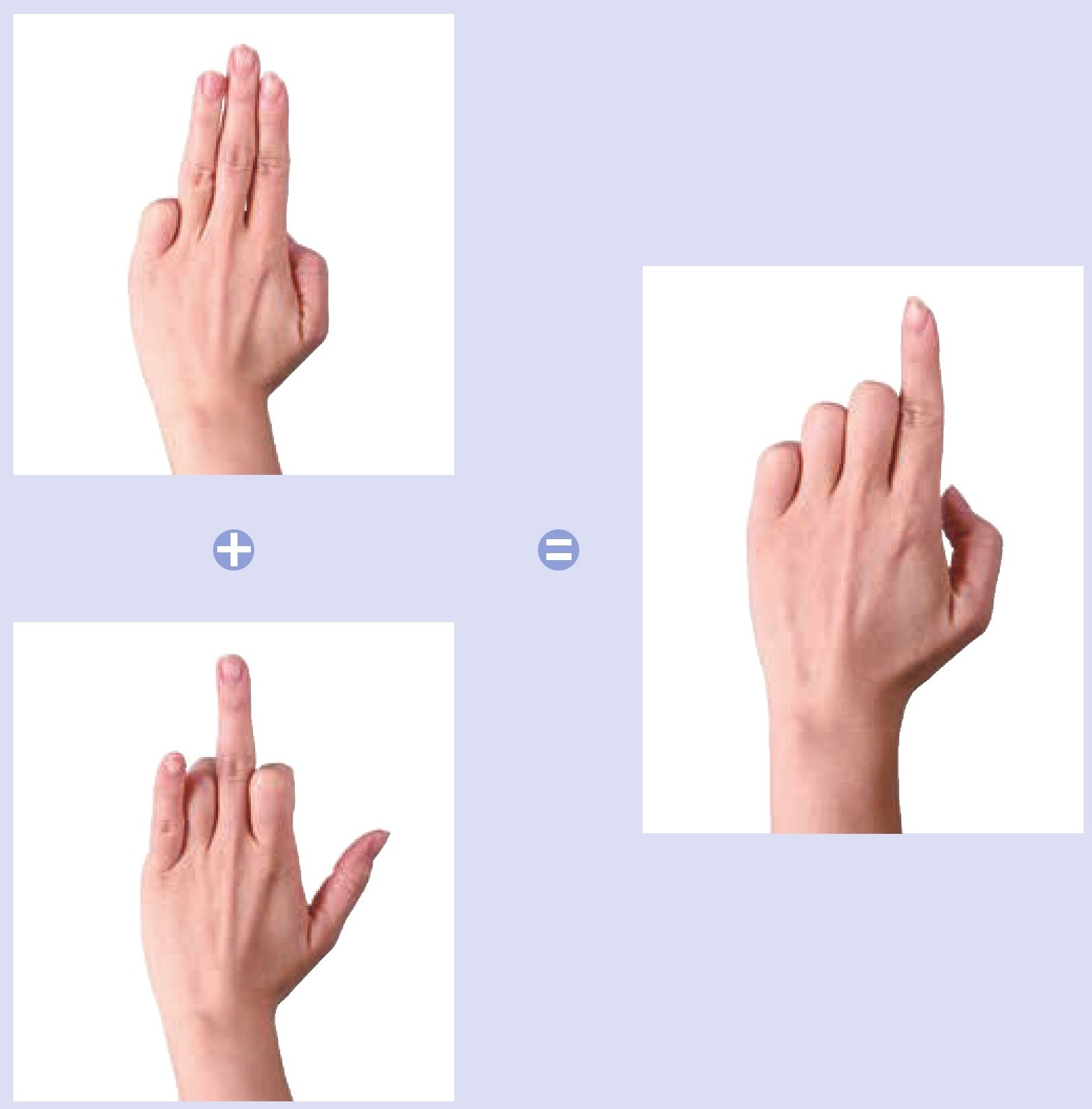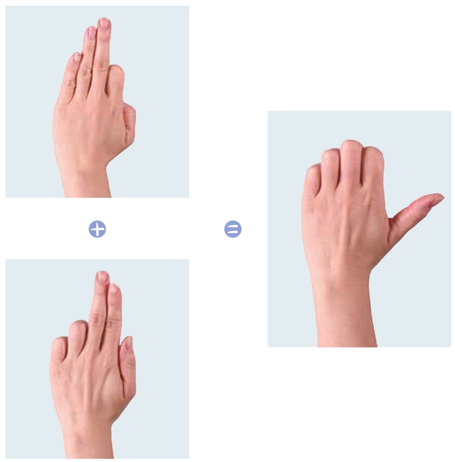 左手拇指和小指同时弯曲一下伸直,在心里默念“2”,接着食指和无名指同时弯曲一下伸直,同时在心里默念“+2”,然后除食指外其余四指同时弯曲不动,心里默念“=4”。