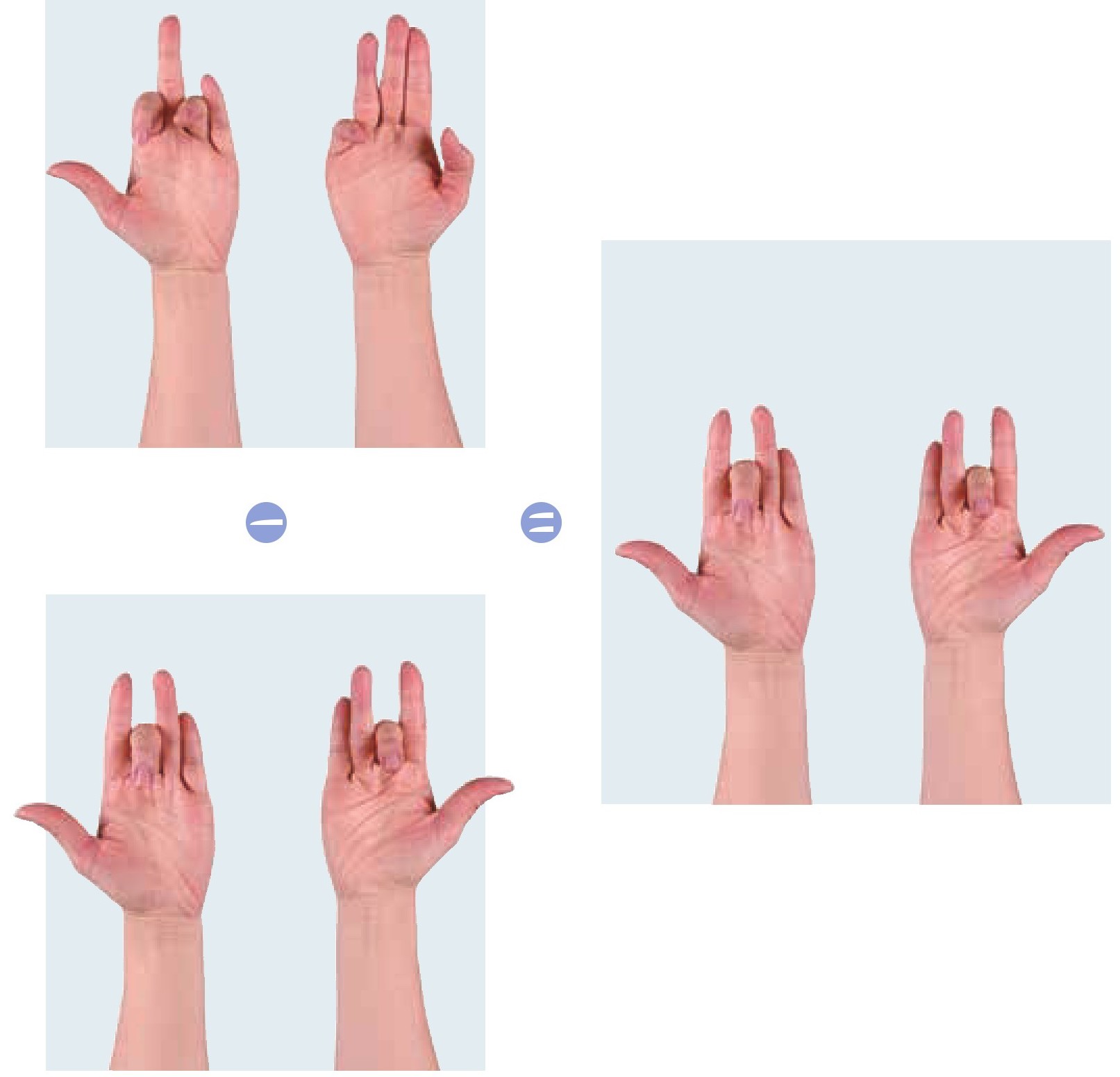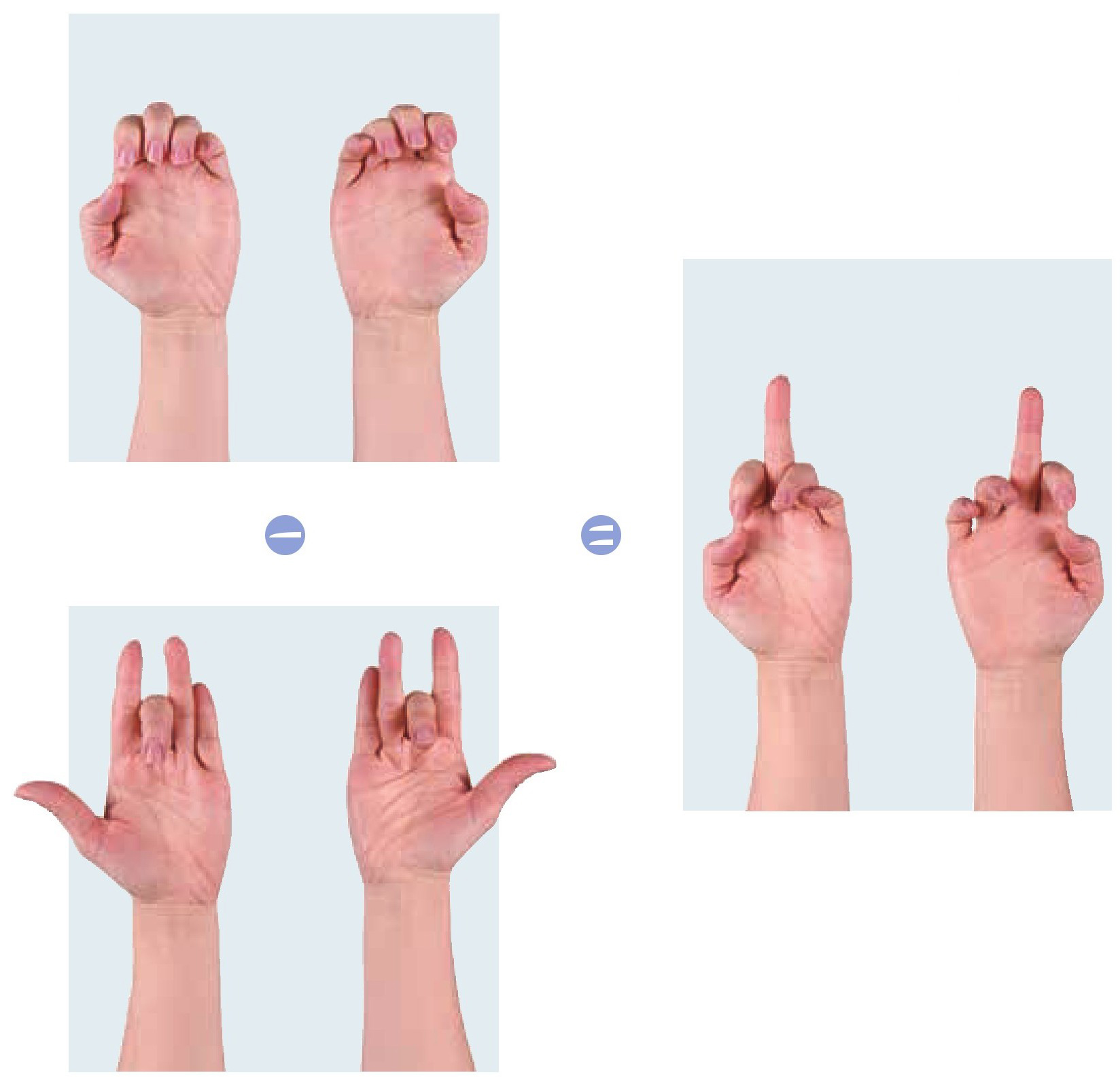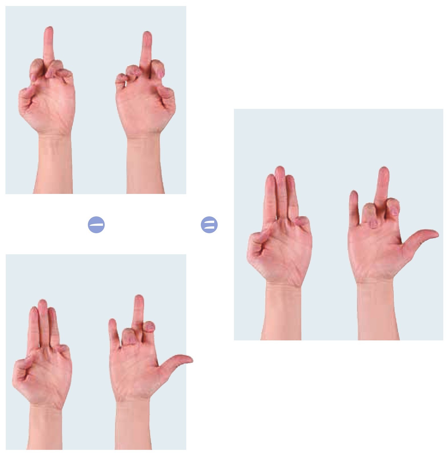 右手拇指、小指和左手食指、无名指同时弯曲一下伸直,心里默念“2”,接着双手中指同时弯曲一下伸直,再弯曲保持不动,心里默念“-1=1”。