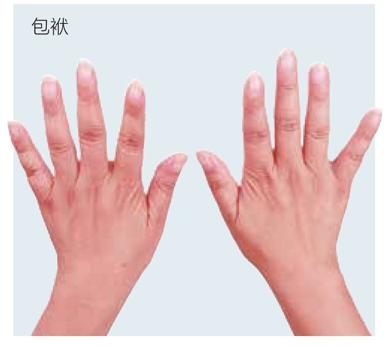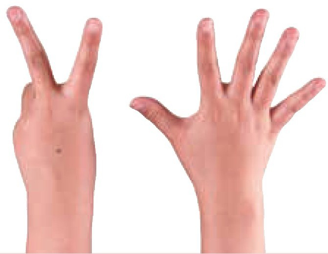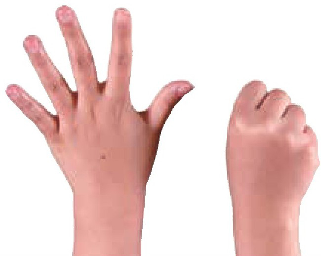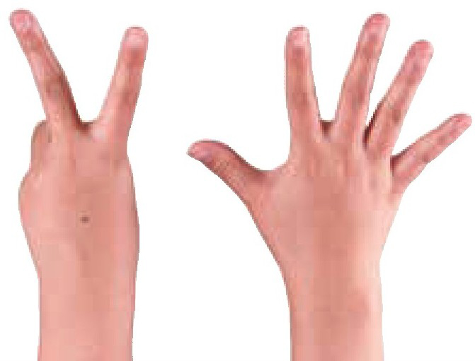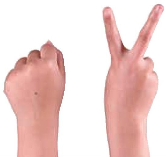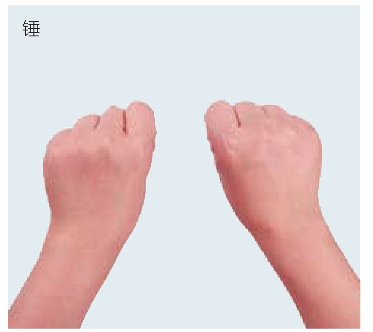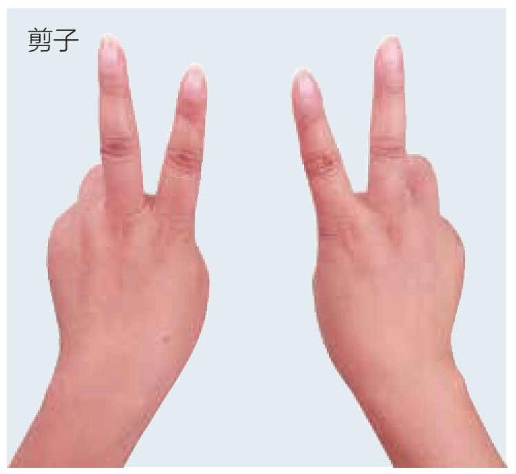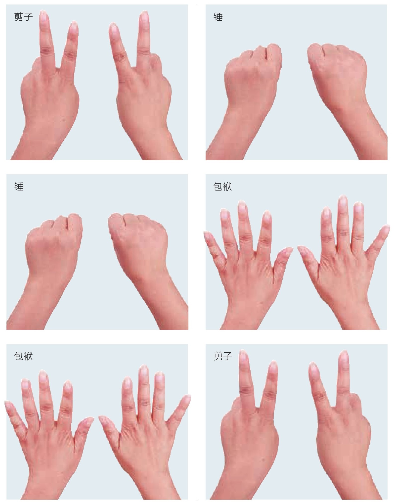 双手按照“包袱、剪子、锤”“剪子、锤、包袱”“锤、包袱、剪子”的顺序来同时做手势练习。