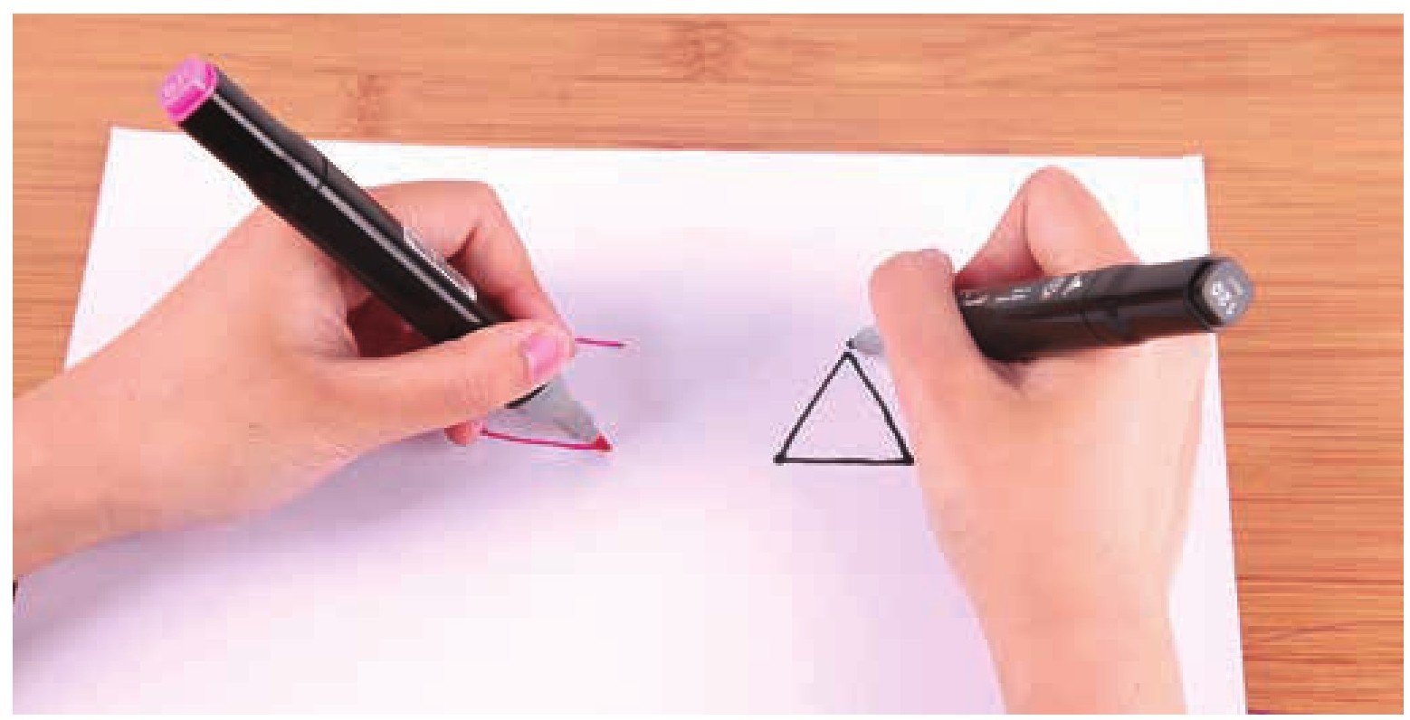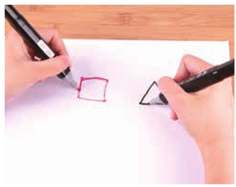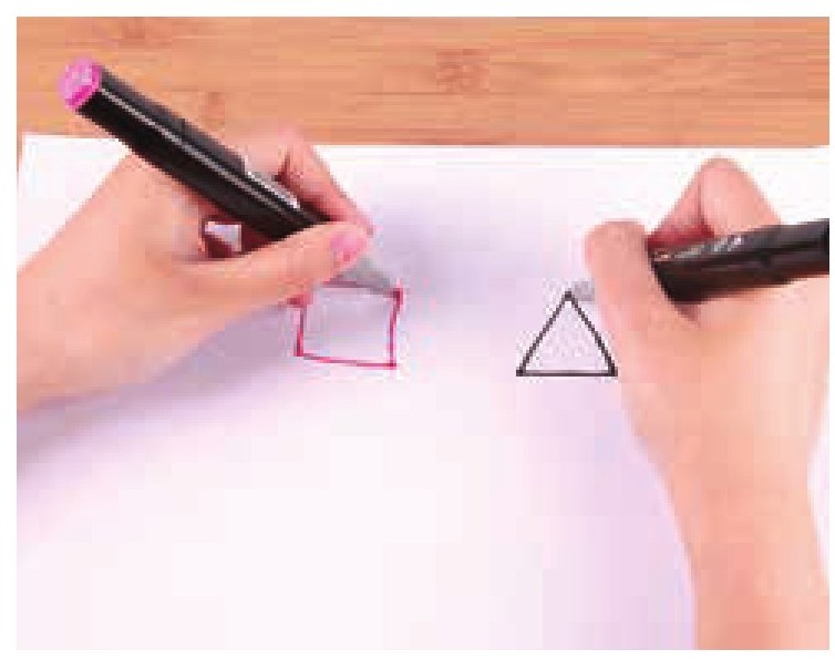 刚开始练习时,可以先在纸上画好相应的图形,然后双手描边完成熟练后,可以直接在纸上画△、□、〇等不同形状组合图。画完以后多描几遍。