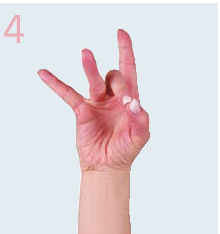 五指张开,右手拇指依次点食指1下,点无名指2下,点小指3下,点中指4下。换左手重复动作。