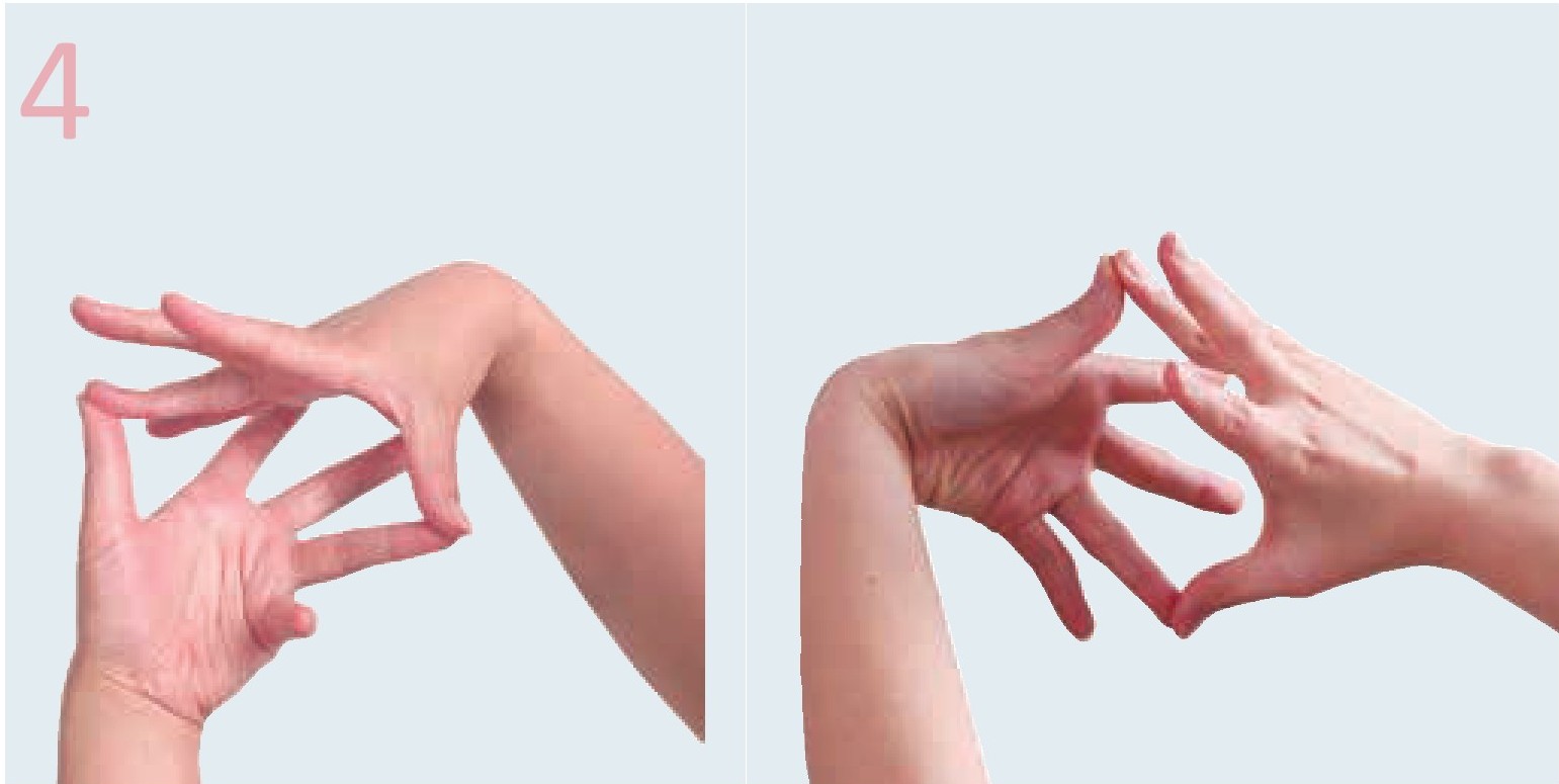 这是一套连续动作,所以在做下一个动作时要保持上一个动作手指姿势,不要断开。练习熟练后,可以凭记忆快速转动手指。