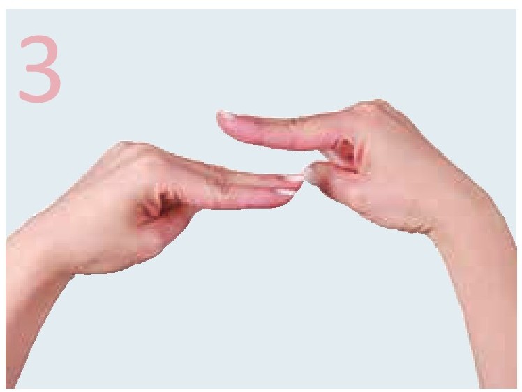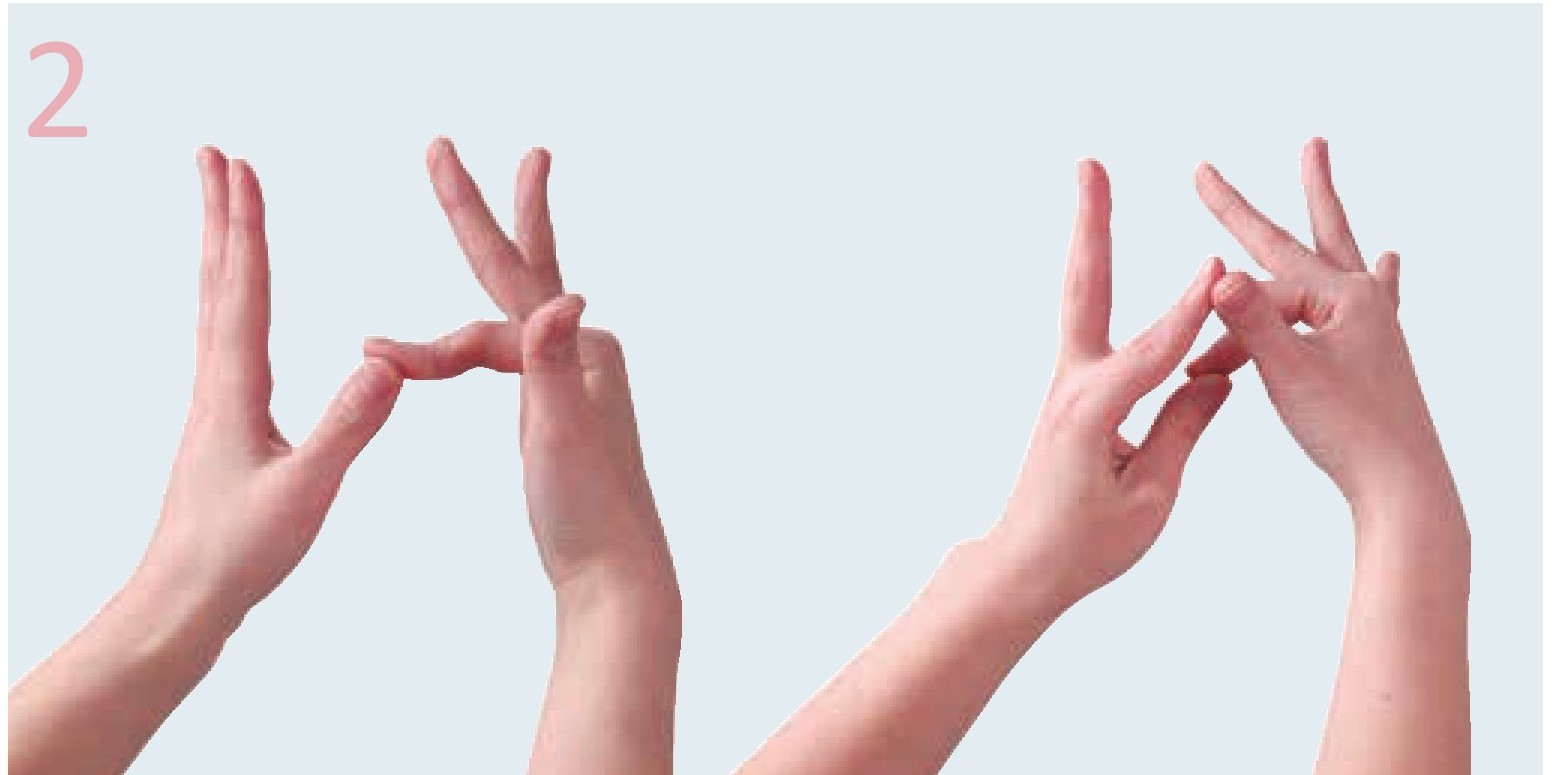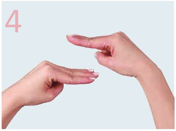 双手相对,五指张开,依次伸出左右手指,指腹互相碰触,不碰触的手指尽量保持伸直。
