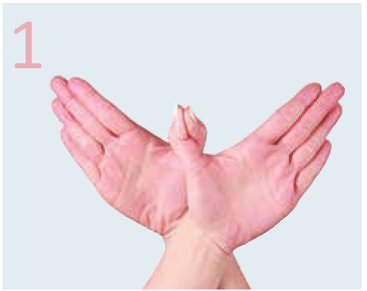 双手五指并拢掌心朝内,两拇指相勾,呈燕子展翅飞的姿势