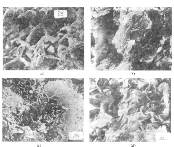 (a)粗粒高岭石;(b)中等大小颗粒的高岭石;(c)蒙脱石(微晶高岭石);(d)伊利石(水云母)