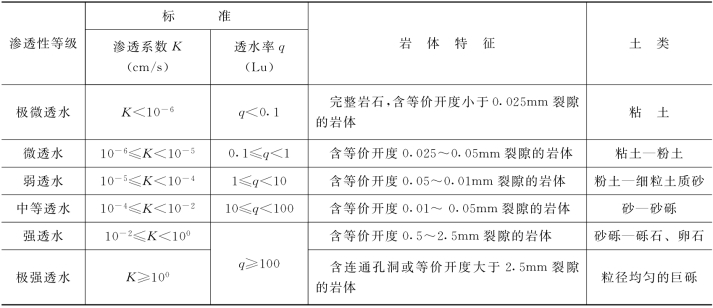 根据透水性的不同将岩石分为:极微透水、微透水、弱透水、中等透水、强透水、极强透水岩石等6 类(见表1-11)。工程上,一般将极微透水的岩土层作为隔水层。