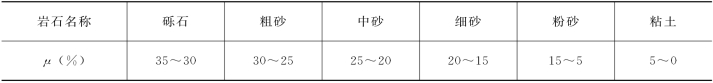 岩石的给水性与透水性成正比。岩石透水性越强,其给水度值越大。松散沉积物的给水度值见表1-12。