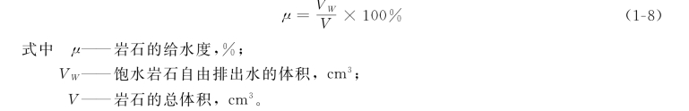 (2)岩石的给水性饱水岩石在重力作用下能自由排出一定水量的性能,称为岩石的给水性。衡量岩石给水性的指标是给水度(μ)。给水度是指饱水岩石能自由流出水的体积与岩石总体积之比,通常用百分数表示,即