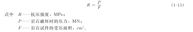 (1)岩石的抗压强度(R) 岩石的抗压强度是指在单向压力作用下,抵抗压碎破坏的能力。其值用岩石达到破坏时的极限压应力表示: