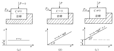 (a)抗切试验及抗切强度;(b)抗剪试验及抗剪强度;(c)抗剪断试验及抗剪断强度P—正压力;PH—水平推力;τ—剪应力;σ—正应力;τ—PH/F;σ=P/F;φ′—内摩擦角;C—粘聚力