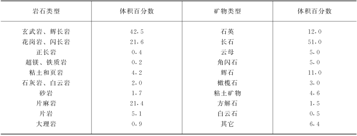 地壳是由岩石组成的。从分布面积来看,沉积岩占75%,岩浆岩和变质岩仅占25%;从体积含量来看,岩浆岩占64.7%,变质岩占27.4%,沉积岩仅占7.9%;从地质时代来看,变质岩的形成约占全部地质历史的5/6,前震旦界(包括太古界和下元古界)地层,经受强烈的褶皱和岩浆作用的影响,主要是由各种变质很深和较深的岩石组成,构成陆地古老的基底部分。前震旦界以后的地层则是没有变质的或变质程度很低的沉积岩,形成古老基底的盖层。通过学习,要认识地壳中常见的岩石和矿物(表1-16)。