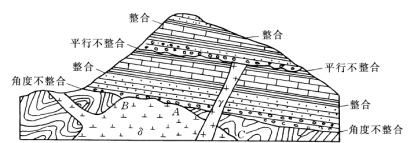 (3)角度不整合接触是指两套地层产状不一致,在接触面上呈一定角度相交,其间缺少某地质时代的地层。不整合接触面上往往保存着古风化壳和底砾岩,有明显侵蚀特征。它说明地壳有过强烈的水平挤压运动,使先形成的地层褶皱隆起,然后下沉接受新的沉积。