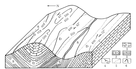1—石炭系;2—泥盆系;3—志留系;4—岩层产状;5—岩层分界线;6—地形等高线