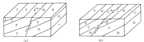 (a)地层缺失(正断层);(b)地层重复(逆断层)