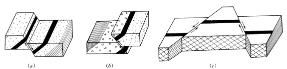 (3)平移断层两盘沿断层面作相对水平移动。它是在水平挤压力作用下,岩层被剪切破裂而形成的,如图2-18(c)。断层面一般平直光滑,有时好象镜面,并有较多的水平擦痕。破碎带中有大量的由岩石碾磨而成粉末状物质所组成的断层泥。