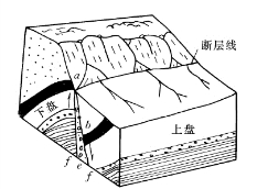(4)断盘是位于断层面两侧的岩块。如果断层面是倾斜的,则位于断层面以上的岩块叫上盘,反之称下盘。如果断层面是直立的,则往往以方向来说明,如断层的东盘或西盘、左盘或右盘等。还可以根据断层面两侧岩块运动方向分为上升盘和下降盘。