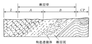 (3)断层带的构造岩在断层带(包括破碎带和影响带)内因受构造作用所产生的动力变质岩,统称构造岩。除断层角砾岩外,它还包括断层泥、糜棱岩、压碎岩、片状岩等。