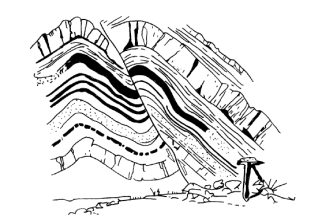 (2)岩层的牵引褶曲是指断层两盘在相互移动时,断层带两侧的岩层因受其影响而形成的小弯曲(图2-23)。一般情况下,牵引褶曲在柔性岩层和薄层岩石中易于形成,厚层岩石中则少见。根据牵引褶曲的弯曲方向,可以判断两盘相对位移的方向。