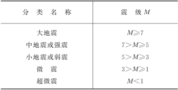地震按释放能量的大小来划分等级,震级从1 级到8.9 级划分为10 级(表2-5)。一般说来,7 级以上的浅源地震,可以引起大的灾害,7 级以下至6 级的地震,可以造成一定的灾害,但影响的面积较小;小于5 级的地震,多不会造成灾害。所以,对于5 级以上地震,国家通过监测、分析确认后将向社会发布。地震按震级可进一步分类,见表2-6。