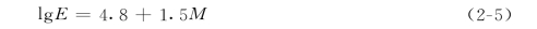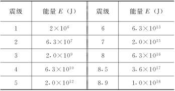 震源释放出的能量越大,震级就越大。震级每增加一级,能量增大约32 倍。1956 年古登堡给出震级M与释放能量E两者之间的关系式为
