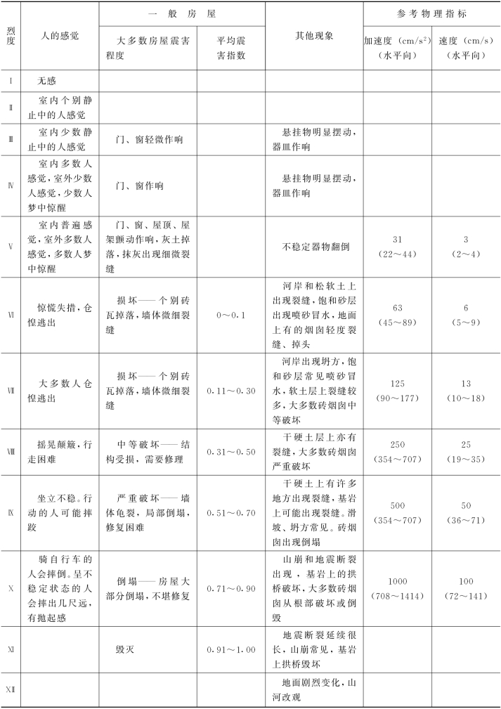 烈度是指地震对地面和地表建筑物的影响和破坏的强烈程度。1883 年罗西一佛瑞尔最早提出了地震烈度表,将烈度分为ⅩⅡ度。我国和世界上大多数国家一样,采用ⅩⅡ度烈度表(表2-8)。