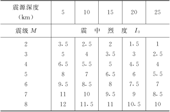 式中I0 为震中烈度。震级与震中烈度及震源深度的关系如表2-7 所示。