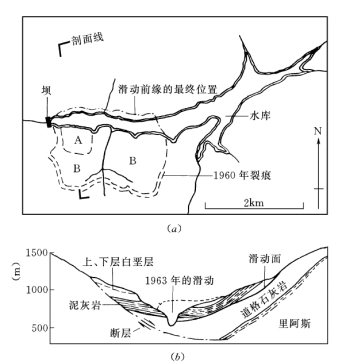 (a)水库平面图,图中A为1960 年的滑坡,B为1963 年的滑坡;(b)剖面图