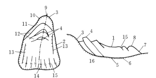 1—滑坡体;2—滑坡周界;3—滑坡壁;4—滑坡台阶;5—滑动面;6—滑动带;7—滑坡舌;8—滑动鼓丘;9—滑坡轴;10—破裂缘;11—封闭洼地;12—拉张裂缝;13—剪切裂缝;14—扇形裂缝;15—鼓张裂缝;16—滑坡床
