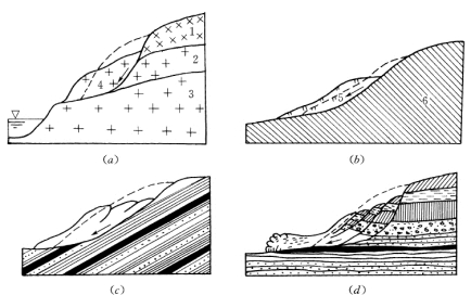 (3)切层滑坡滑坡体切过不同的岩层面发生滑动,滑动面常沿断层面,裂隙面形成,如图3-14(d)。