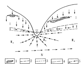 1—包气带之局部隔水层;2—最高水位;3—最低水位;4—悬挂含水层水位;5—地下水流动方向Ⅰ—垂直循环带;Ⅱ—地下水位季节变化带;Ⅲ—完全饱水带;Ⅳ—地下水深部循环带