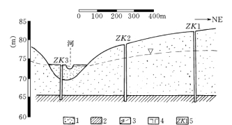 1—砂土;2—粘性土;3—潜水面;4—钻孔;5—钻孔编号
