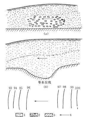 1)潜水补给河水,如图4-6(a)所示,潜水面倾向河流,多见于河流的中上游山区。