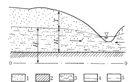 1—透水砂层;2—隔水层;3—含水层;4—潜水面;5—基准面;T—潜水位埋藏深度;H0—含水层厚度;H—潜水位