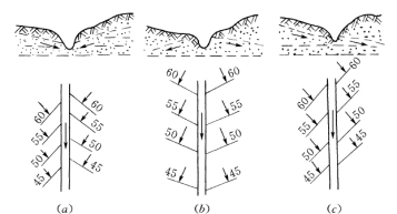 3)河水一岸得到潜水补给,另一岸则河水补给潜水,如图4-6(c)所示,即潜水面一岸背向河流,一岸倾向河流,这种情况一般出现在山前地区的河流。