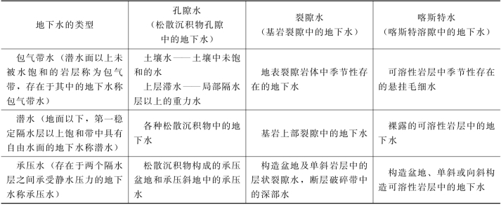 (4)潜水排泄是潜水含水层失去水量的过程,其主要方式有两种:平原区主要以蒸发形式排泄,在蒸发过程中,含水层失去水分,但水中的盐分积累下来,易形成盐碱地;高山丘陵区则以泉、地下渗流形式排泄于地表沟谷或地表水体。