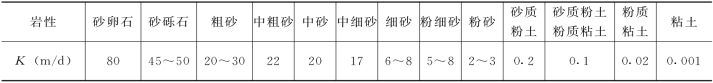 式(4-2)表明渗透流速V与水力坡度i的一次方成正比,故达西定律又称线性渗透定律。当i=1 时,V=K,说明渗透系数在数值上等于水力坡度为1 时的渗透流速。松散岩层渗透系数K经验值见表4-3。