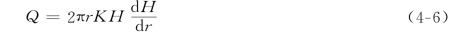 取隔水底板井径方向为r轴,井轴方向为H轴(图4-12),距井轴r处任一过水断面面积为A(该处过水断面高度为H),水力坡度为i,则